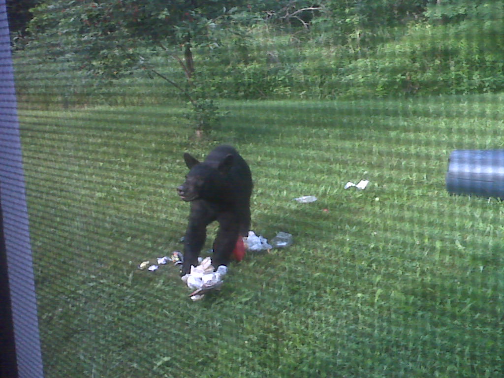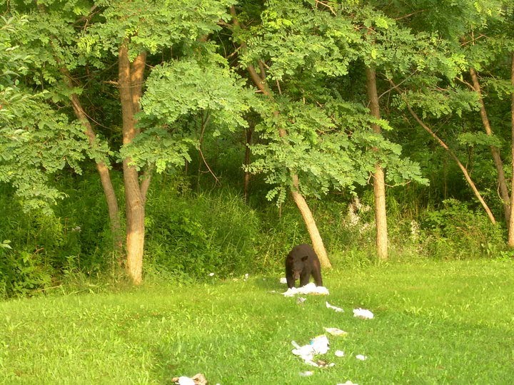 So as recently as last week we had a black bear sighting…and as close as, well…my backyard!! Woke up in the morning to a banging on the side of the house, which turned out to be a black bear feasting on the trash inside my garbage cans. The bear spend all day in our backyard and eventually tore to pieces our cherry tree, bird feeder and four bags of garbage. I called the DEC to report the bear sighting and to see if we needed to follow any protocol. Here is the advice the DEC gave me: