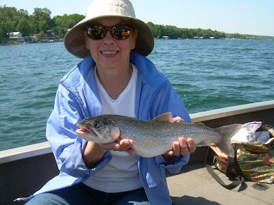 Charter on Seneca Lake with Paul & Janet Grosse for the second time this week. Weather was much different this time around. We enjoyed calm sunny skies and no real wind to speak of. We caught three lakers, and 2 salmon, trolling trout killers behind Michigan stinger flashers. All fish were caught in 25 ft of water.
